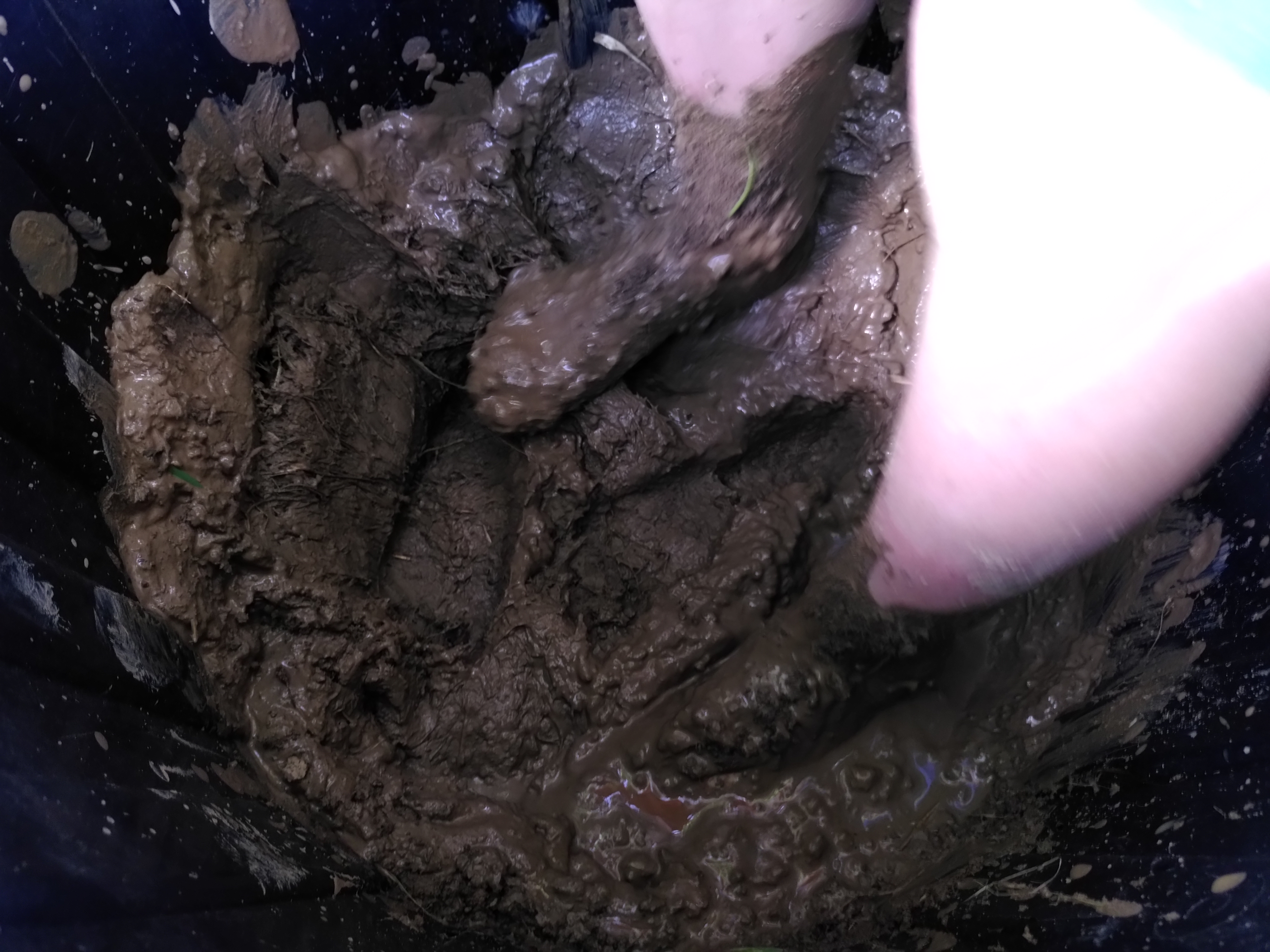 Constructions collectives en torchis avec des matériaux trouvés sur place : galets, branches de noisetier, saule ou autres, terre argileuse, herbe, paille ou foin, sable, eau.