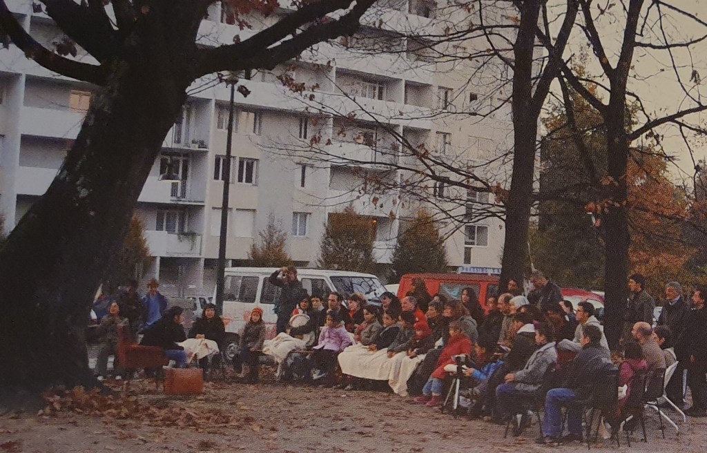 Lieu : en ville ou village, dans un espace vert, sous un arbre.
