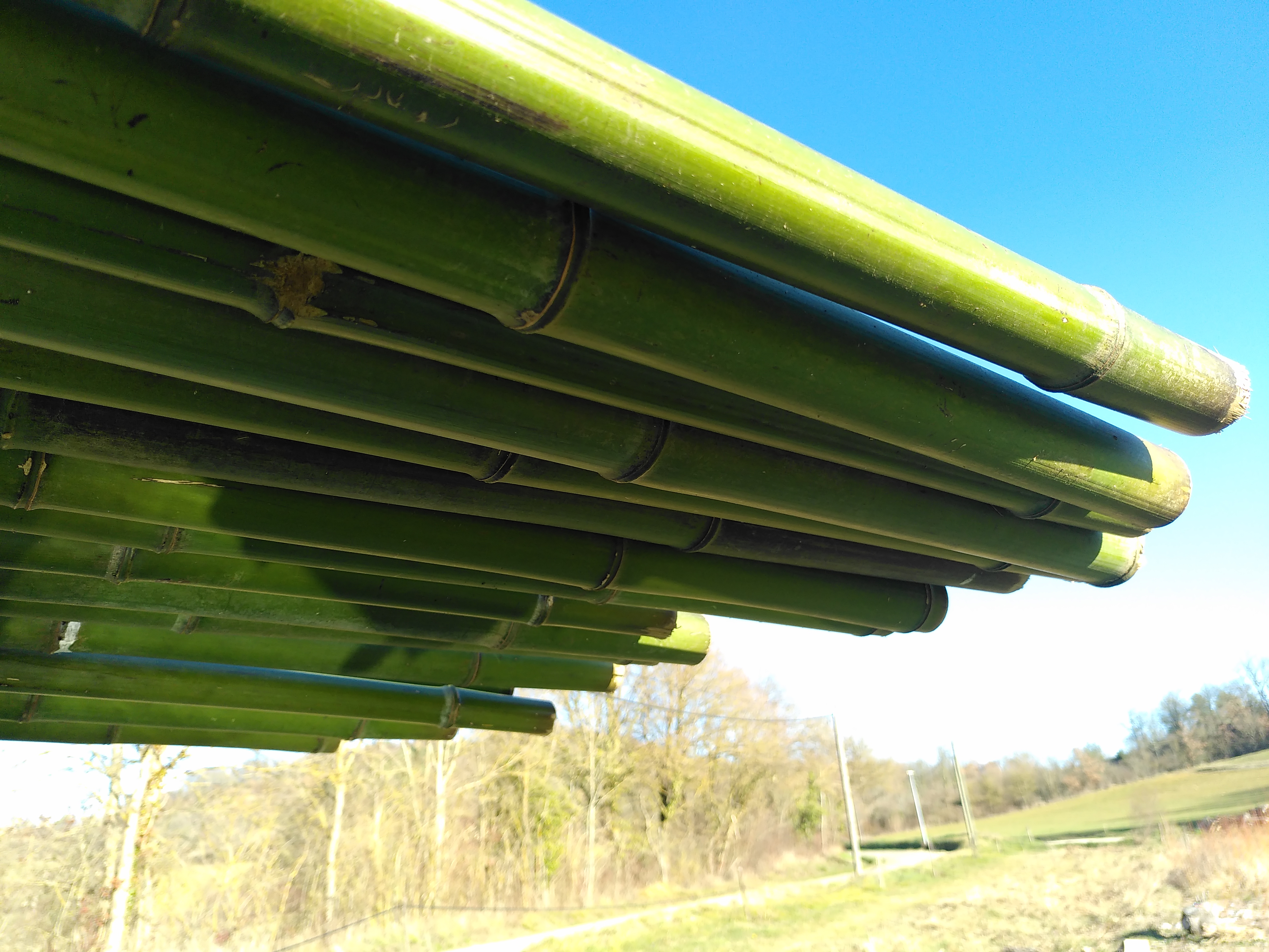Constructions légères aux formes organiques en lattes de bambou, végétaux et terre crue.