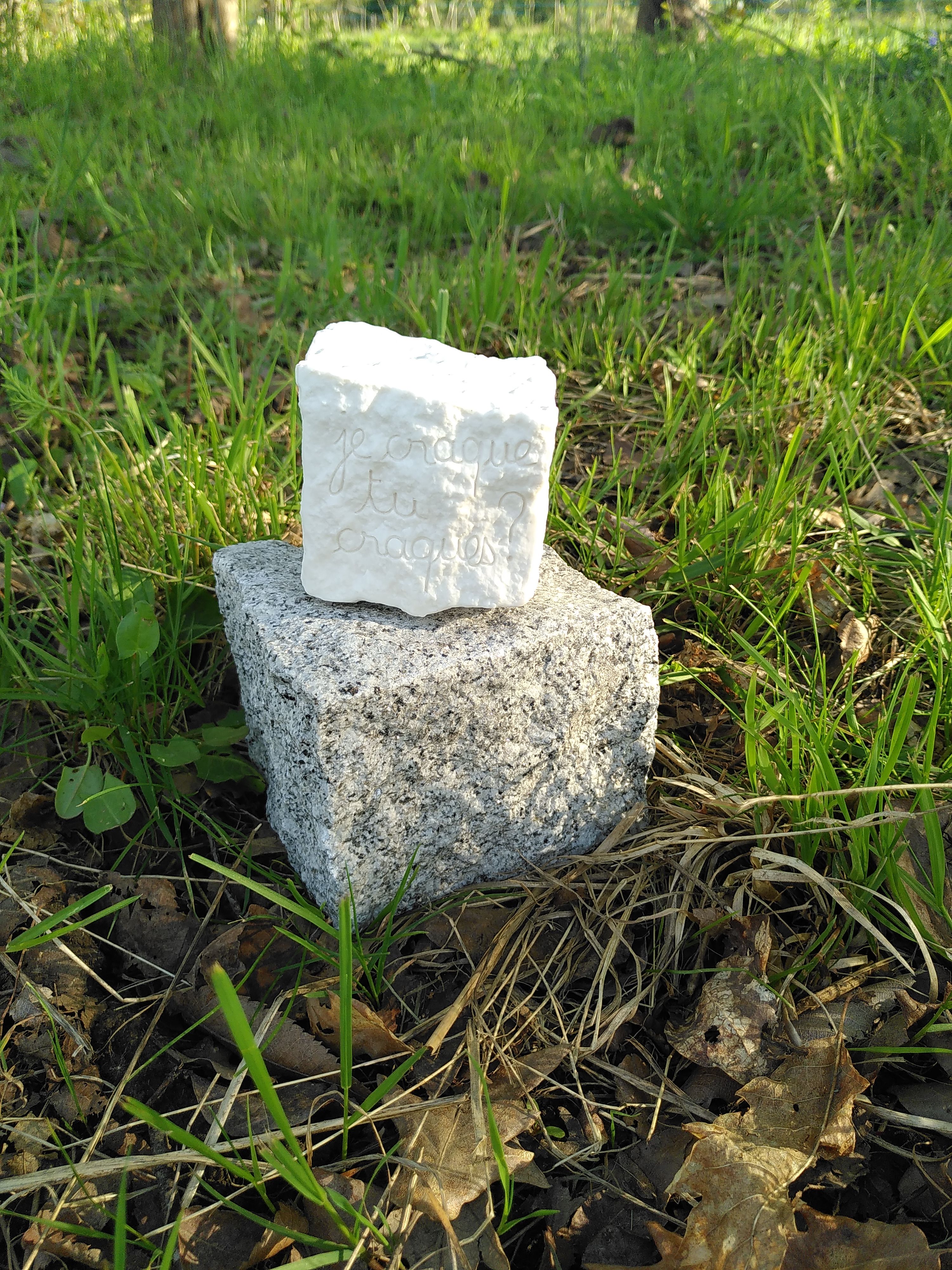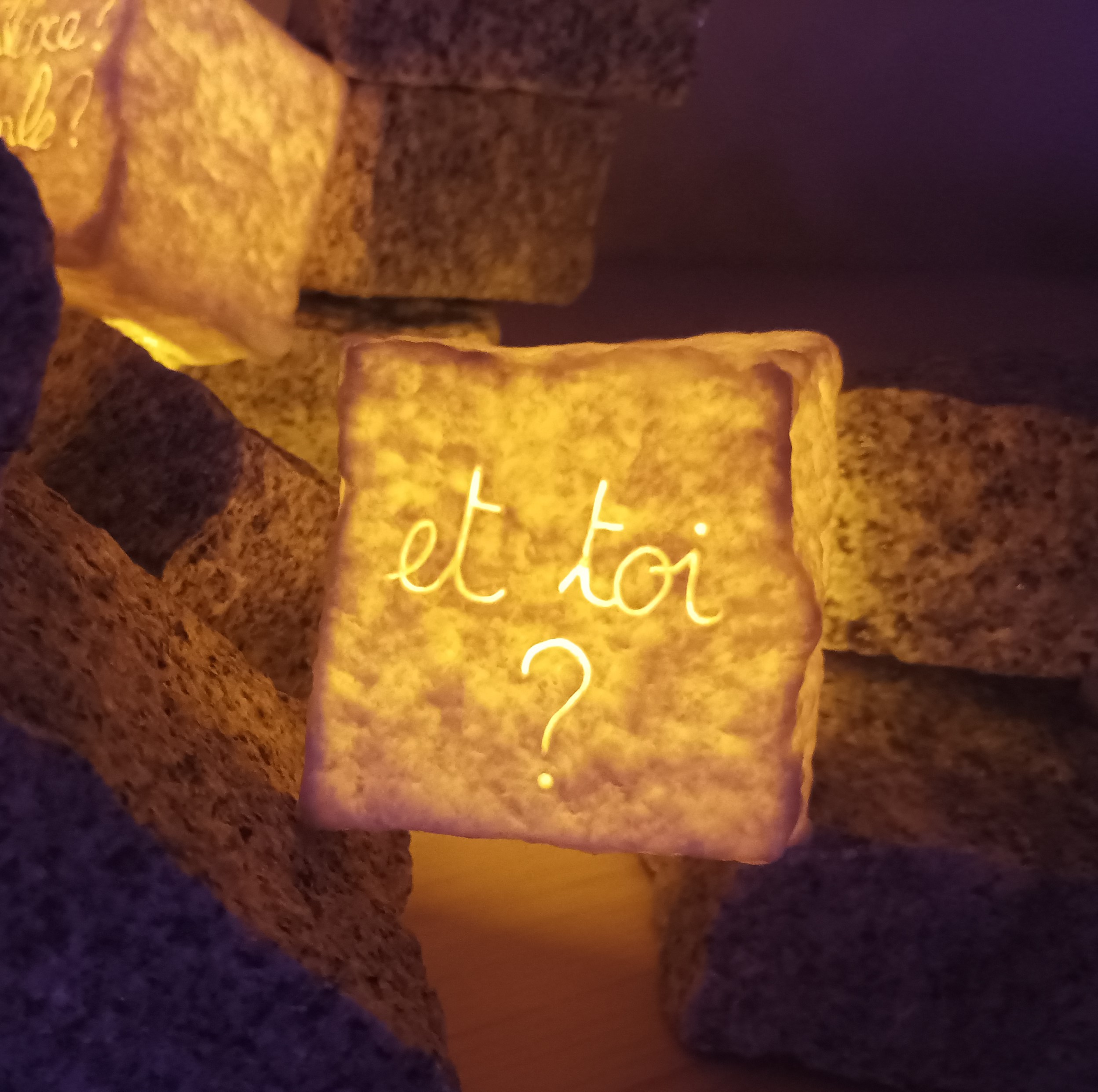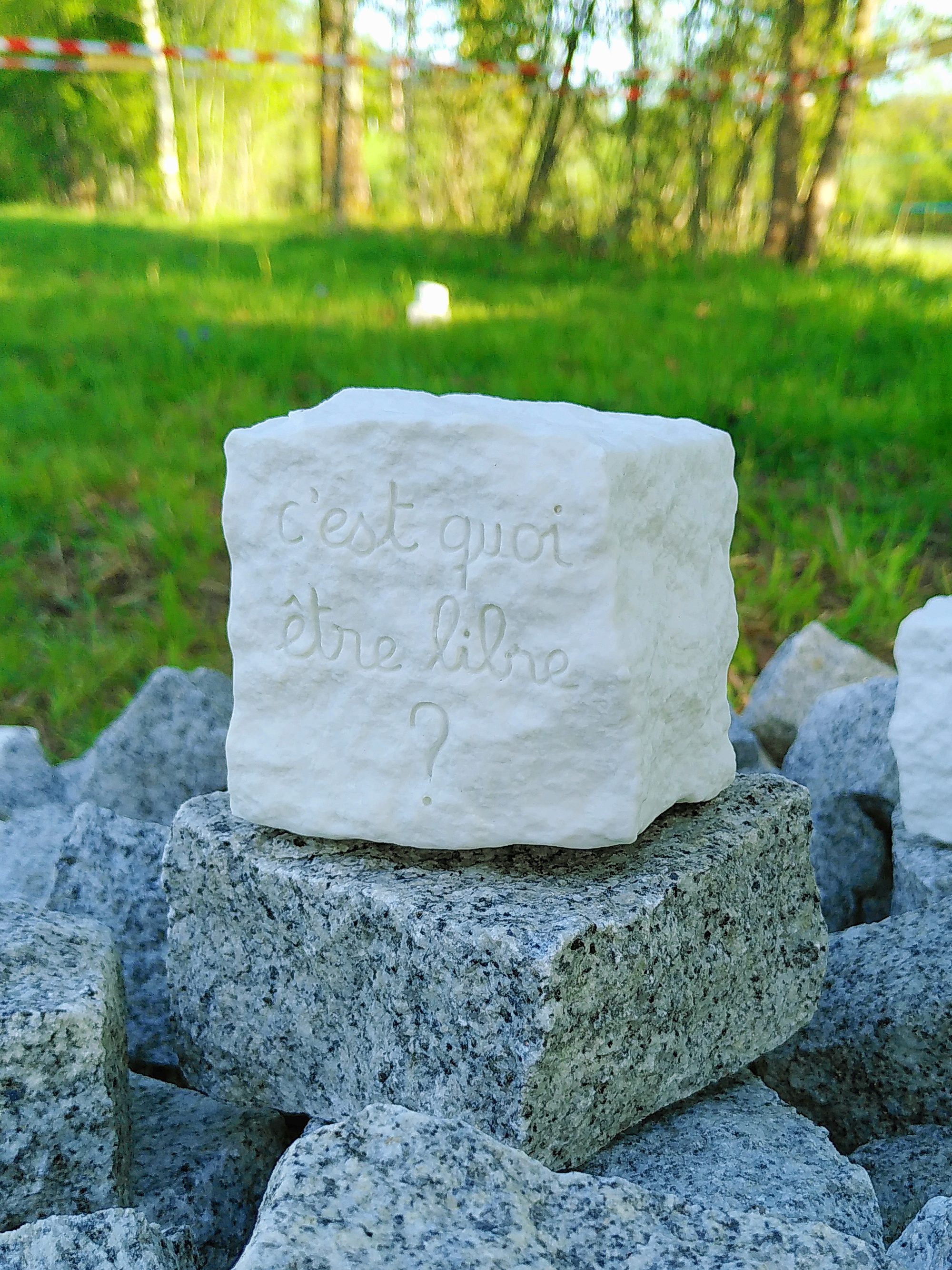 Cette installation est évolutive et participative. Si vous avez des idées de mots à graver sur de futurs pavés, qui compléteront l’ensemble, vous pouvez les déposer à cette adresse : atelier-des-samares@mailo.com Merci !